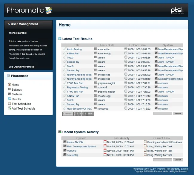 Whether you are just an enthusiast using the Phoronix Test Suite on a couple of systems or are a company looking to automate the scheduled execution of Phoronix Test Suite tests across a multitude of systems, we invite you to try out this public beta of Phoromatic.com and to supply feedback to us as we have a platter of new features to still implement.