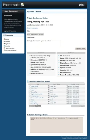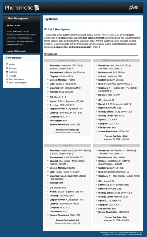 From the web-interface, Phoromatic also shows all linked-up test  systems along with their installed software/hardware, which is maintained in real-time  and shown are any test errors/warnings generated on that test system along with  the current tasks of that test system.